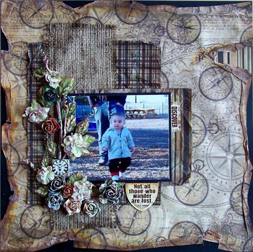 This is one of my favorite photos of Christian from the photos we took last fall at the playground. He wandered all over the playground with his father in tow. 😀 Little cutie was so tiny he could even walk with room to spare beneath all the equipment! I combined the Tic-Tac-Toe challenge at The Paper Variety with an awesome sketch from Creative Scrappers to create this layout. The quote on the diecut sticker that reads, “Not all those who wander are lost” by Tolkien is one of my faves, so I just had to use it for this page.