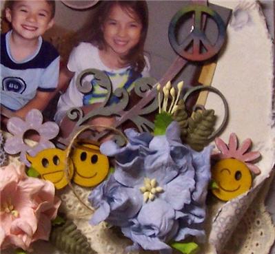 To create my page, I used several Creative Embellishments stamps on the background and layering some CE chippies with papers and metal pieces that I intentionally rusted. To alter the title, circles and panel, I just applied acrylic paint. For the view master slide, I then inked over it with distress ink. The frond I gessoed, then used distress stain, allowing it to puddle unevenly on the piece and air dry.