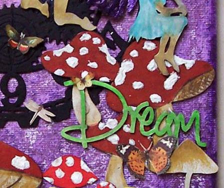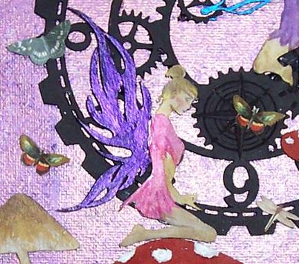 I started my piece by dabbing the blank canvas with jacquard paints in 2 different shades of purple. You can’t see it well because one is iridescent. Next, I painted my 6″ Large Steampunk Clock piece black and adhered it to the canvas slightly off center. I painted the Mushroom Set 1, Mushroom Set 2 and Mushroom Set 3 with white acrylic paint, then added the details using Pitt Markers. I blended white paint, modeling paste and coarse pumice to create the textured spots on the caps. The Wood Veneer Mushrooms were altered just using markers and the textured blend for the spots.