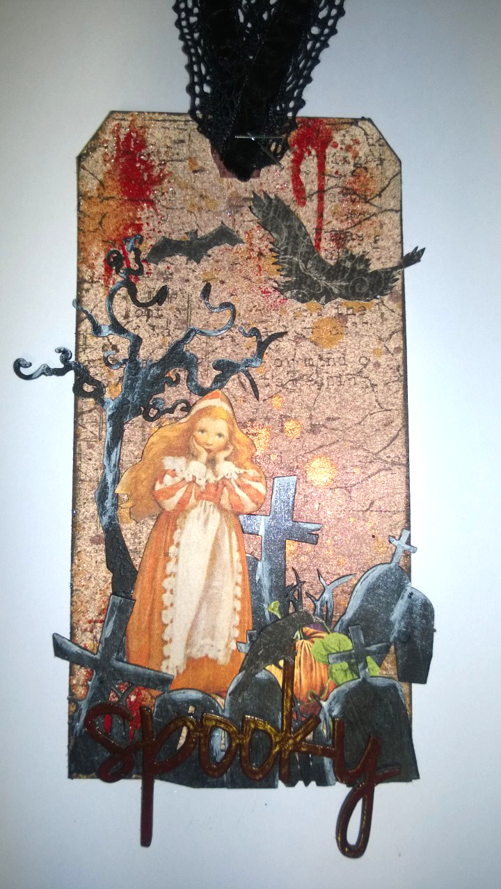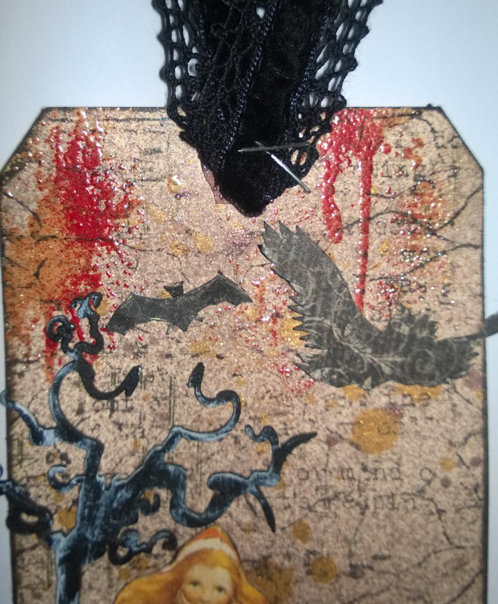 I’ve always loved how Creative Embellishments makes it so easy to put together a quick card or tag without sacrificing dimension. For this quick an easy tag, I used 4 different background stamps. I used stazon ink with the text, crackle, and distressed grid stamps and layered them on the background. I then used the paint splat stamp to heat emboss some splatters for a little added color. I splattered some inks from Lindy’s Stamp Gang onto the base of my tag and misted it lightly with Tattered Angels Coffee Shop mist (my all time fave of their mists). Once I had that complete, I inked the edges with distressed ink. I altered by chippies with black, silver and white acrylic paint and heat embossed the title piece. Here’s how it all came together: