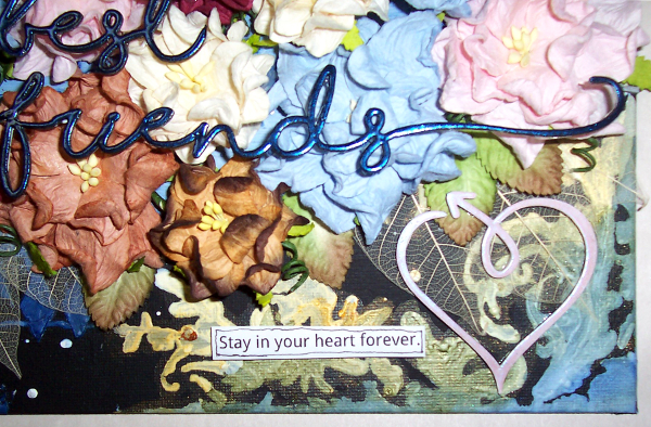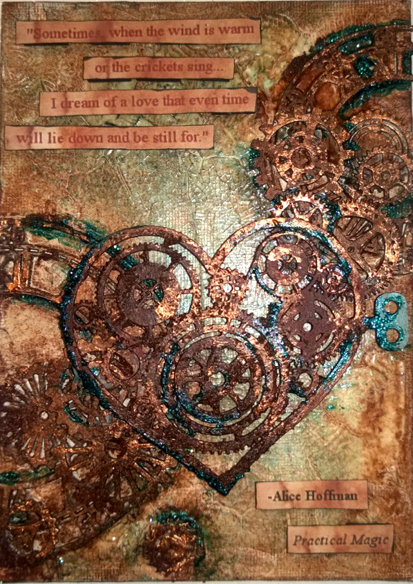 My project today was inspired by a quote from the book Practical Magic by Alice Hoffman (the quote is also in the movie). It’s part of a letter that one of the character writes and the portion I added to my project says, “Sometimes, when the wind is warm or the crickets sing…I dream of a love that even time will lie down and be still for.” It’s one of those lines that really sticks with you, even years after reading or hearing it. 😀 I am still trying to learn how to take pics of projects that are shimmery, so please excuse the poor quality of my photos. In real life, the colors are closer to the cell phone photo. I started out by applying crackle medium and then added the clock pieces and gears. Once that set, I applied a light coating of gesso onto the chippies and colored with acrylic paint. Then applied coarse pumice mixed with acrylic paint, bronze paint, and glass beads colored with Lindy’s Stamp Gang Magicals. I altered the heart piece the same way and applied that last. Here’s how it turned out…