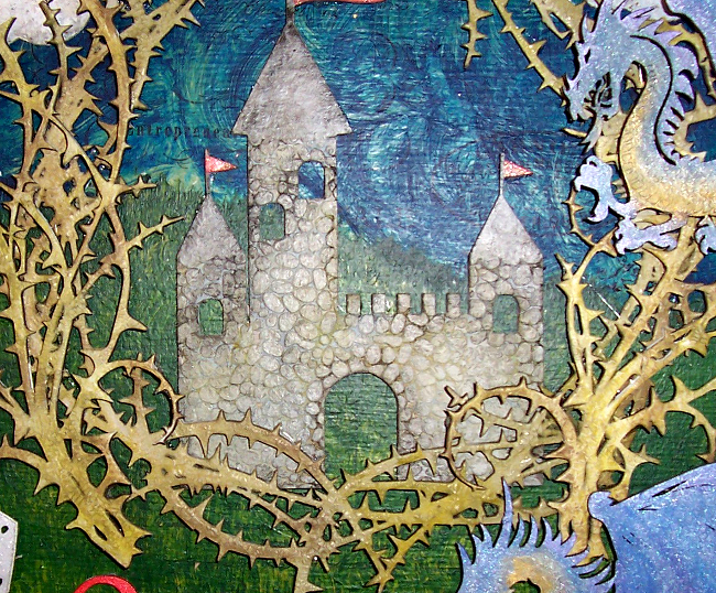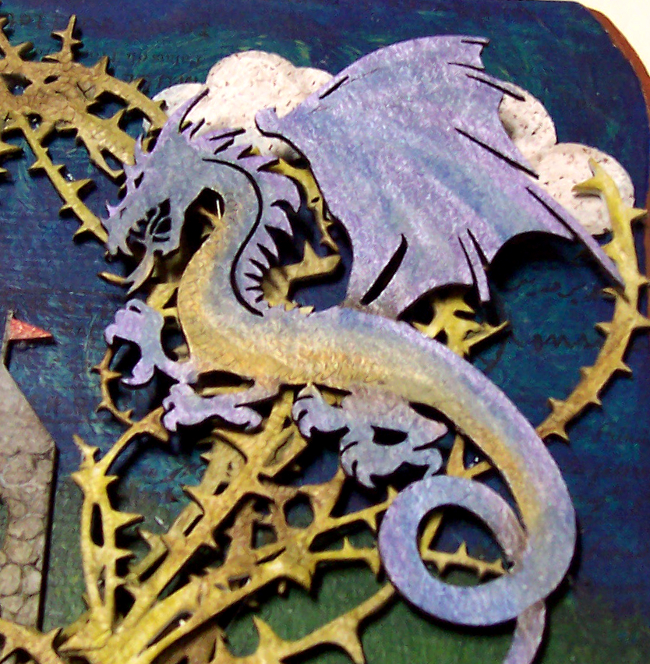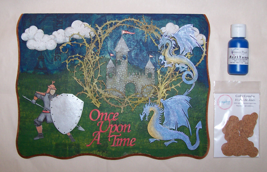 The first project I created has actually been planned for quite a while, so the base had already been prepared. I have a decorative wooden box that I’ve been meaning to alter for my daughter. It’s a sizable piece and the plan is to alter each side and the lid with a different fairy tale inspired scene. For the lid, which I removed to make it easier to alter, I decided to go with Sleeping Beauty since it requires the most space for what I have in mind. I started out by adhering patterned tissue paper to the flat surface. I then used the Blue My Top Shimmerz acrylic paint from the SMS store blended with a black acrylic I already had to create the sky, and green with black and yellow to variegate the grass portion of the background. I altered the Corky Cumulus die cuts from the SMS store using gesso and PITT markers:
