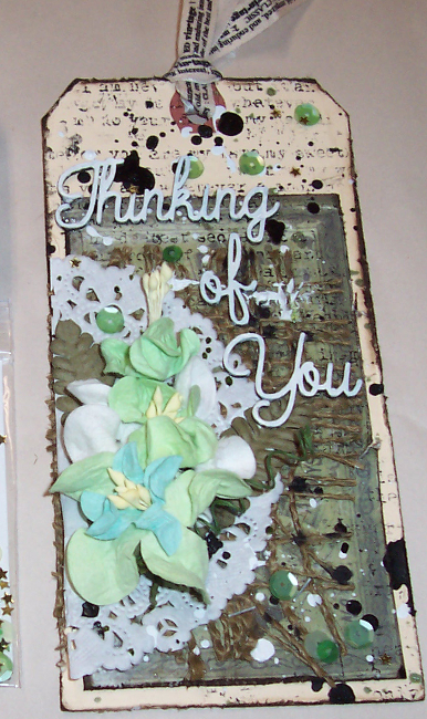For the one on the left, I used Green Acres Sequins from the SMS shop, along with half of a white doily (Jody had packed my goodies in a glassine bag and sealed it by stapling a doily on top. How cute is that?!)