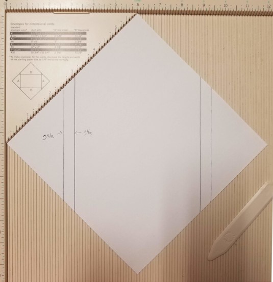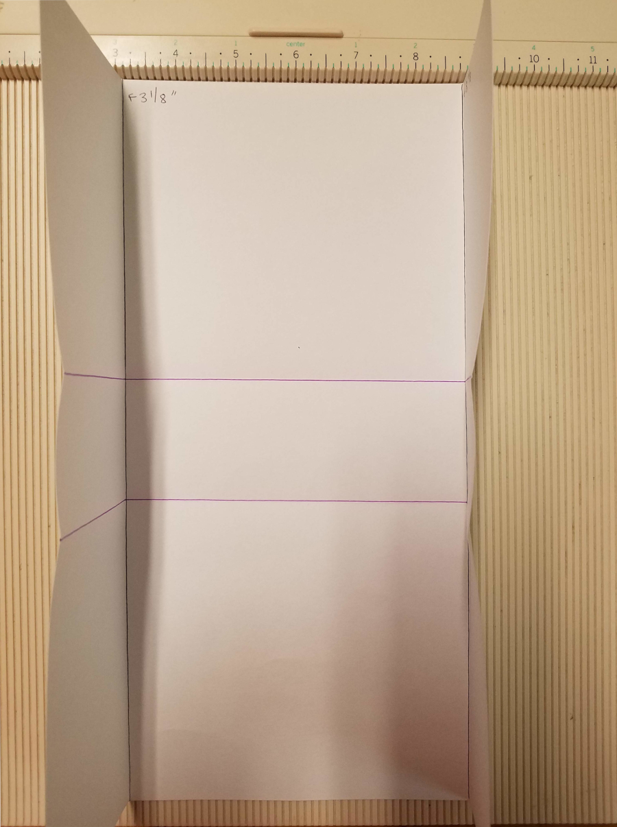 Score your page at 3 1/8″ and 8 7/8″ (which is 3 1/8″ in from each side) as indicated by the black vertical lines.