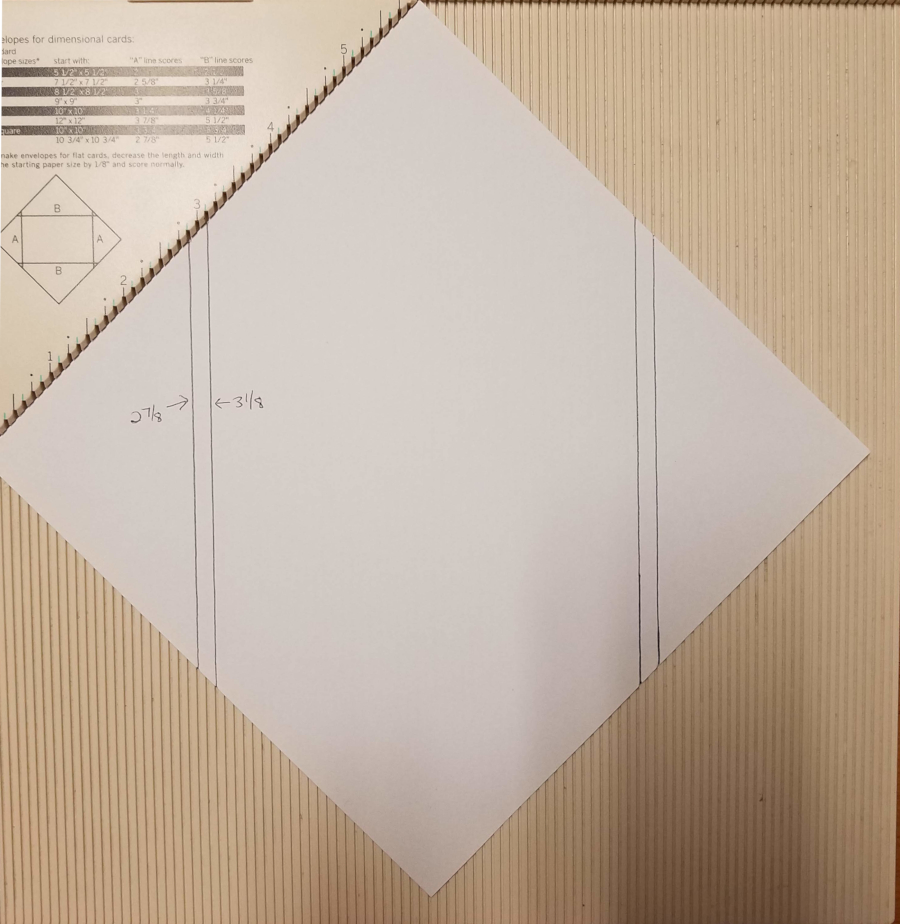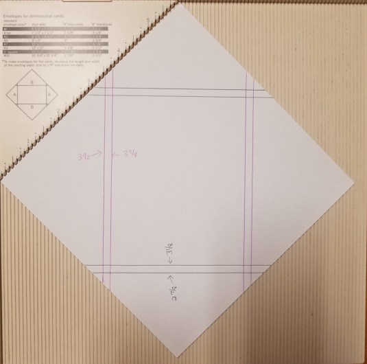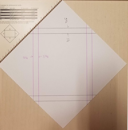 Rotate your paper 90° and score at 5″ and 7″ as indicated by the purple lines. These will be your horizontal lines once you straighten the page again.