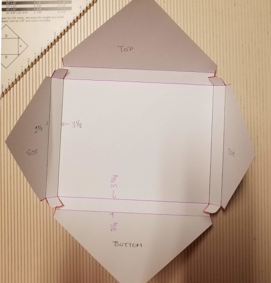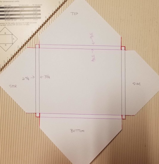 As promised, this is a quick and easy gift bag tutorial to help with ideas for my challenge in the Creative Embellishments online Birthday Crop in their Facebook Fan group. This base template is highly adaptable to make a variety of sizes and designs. I’ll mention a few variations at the end of the tutorial. The measurements I used for this base results in a bag that is 5 ¾” long x 2″ wide x 5″ tall, with sides that are 3 1/8″ high. I used plain white cardstock for this tutorial so I could draw the score lines and write directly on the template. When selecting patterned paper for this project, keep in mind that the paper will wrap around to the back, so you’ll want to use a design that is not directional/direction specific (otherwise, if the front is face up, the back will be upside down).