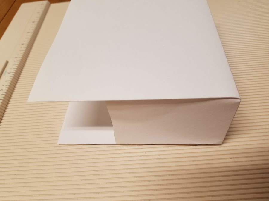 The 2 flaps should overlap slightly and you should be able to smooth it flat. I’ve puckered up the center in the photo to show that the center is not glued down. The adhesive is only going from the diagonal folds to ends.