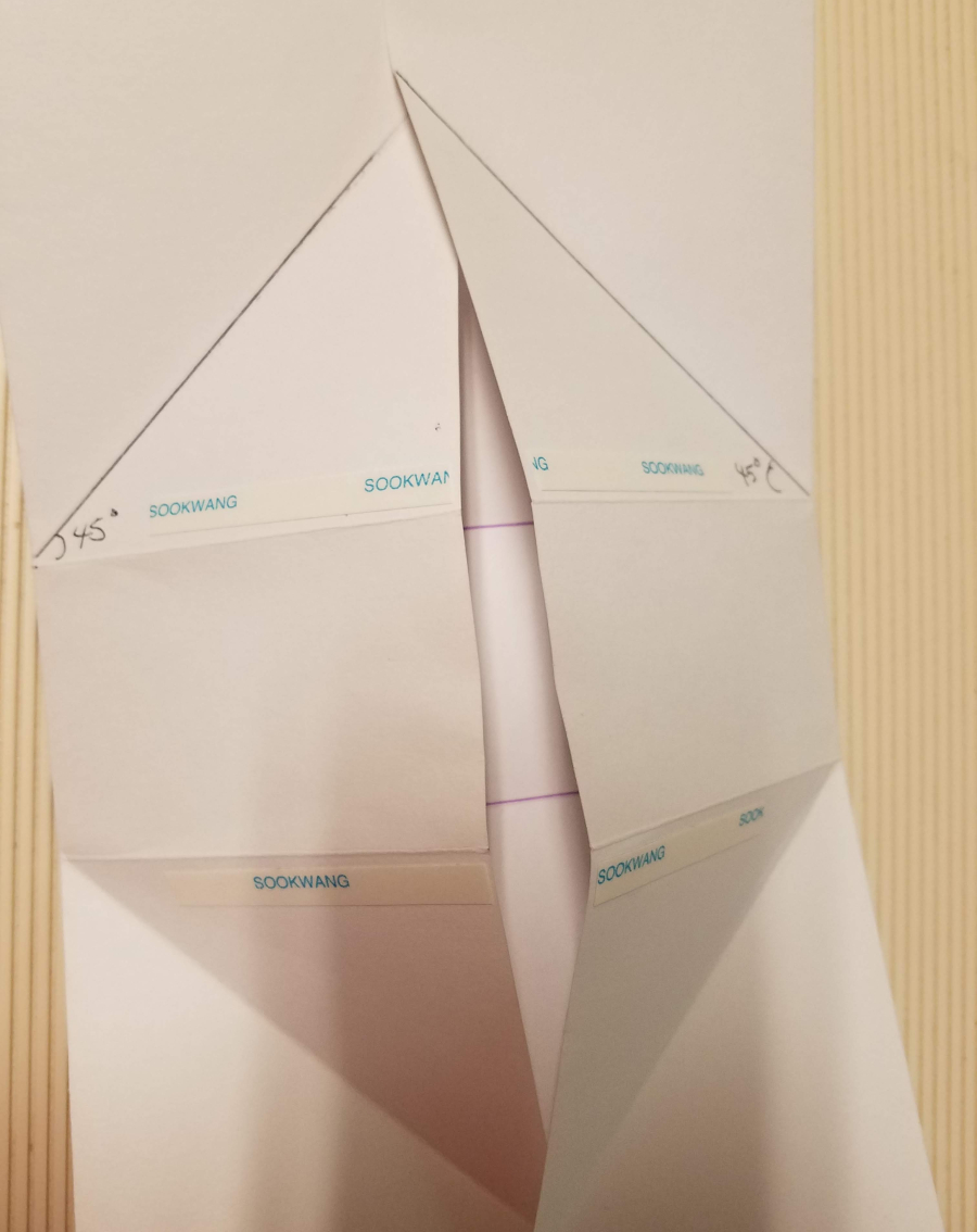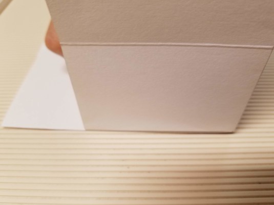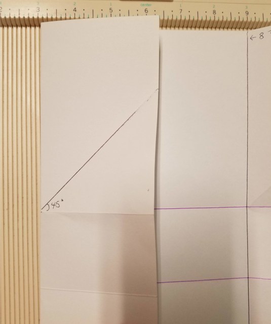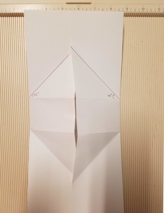 You’re going to create a 45° fold where I’ve indicated with a line in the photo. You do not need to score this. You will create this fold starting at the corner where I’ve written 45° by bringing the horizontal scored line up to meet the vertical fold line. Doing this will automatically create a 45° angle.