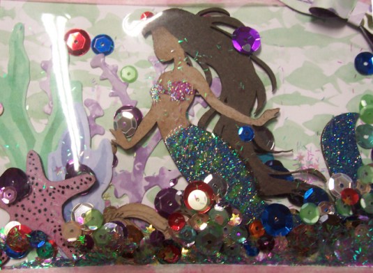 Using a Fuse tool, I created a shaker card for fun. 😀 I altered this mermaid the same way I altered the other one from this set. buried in the sequins and glitter, there is a starfish along with a conch shell, and some more cardstock die cuts. Though the Fuse tool did a good job closing up the pocket, I added washi tape to seal all the edges as a safeguard since I did include the dreaded glitter. lol Close up of the altered mermaid in the shaker card: