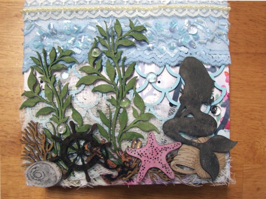 To embellish the back, I started some of the same trims I used on the front, then added bits of the wave panel that were left over from the front, then layered cheese cloth over it, then added flourish 21, some shells, another crab, and more die cut pieces from the Kaisercraft die cut packet. Close up of the embellished back of the LE: