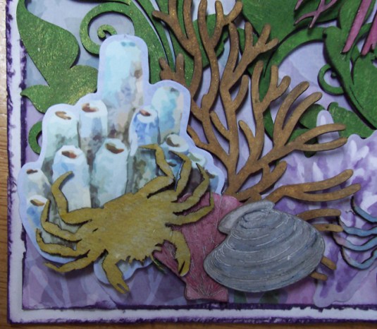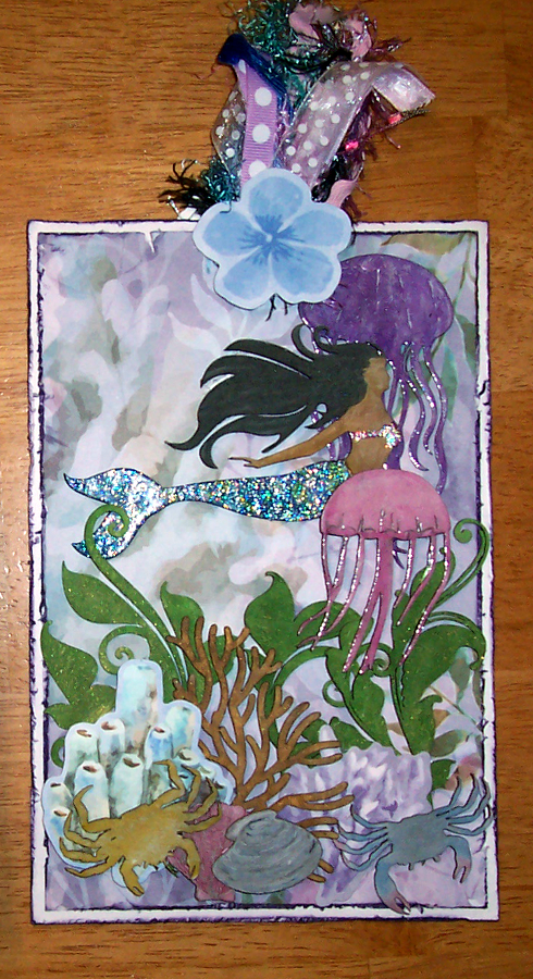 For the large tag, I altered the coral, shells, crabs, flourish 19, and flourish 20 the same as the other chipboard pieces, but heat embossed the jelly fish and mermaid after altering them with markers. Close up of the tag: