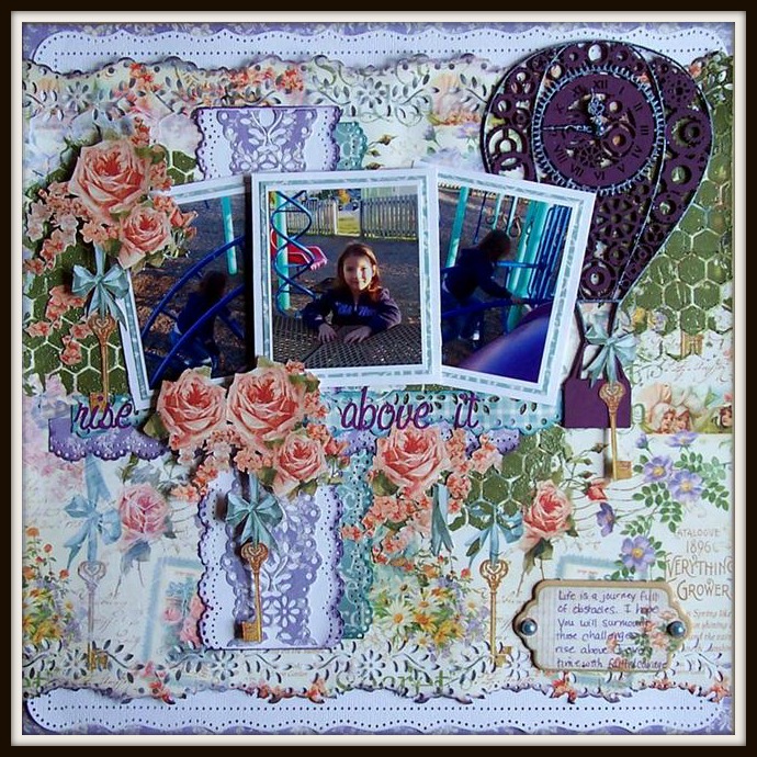 Here’s a close up of the Creative Embellishments Steampunk Hot Air balloon I used on my page. I altered it by applying a coat of Tim Holtz distress paint, then going over it with distress stain in a slightly darker shade. I then highlighted select areas with Smooch Ink in “cape cod” which is a lovely shade of blue:
