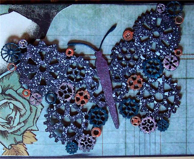 For my example, I used their gorgeous steampunk butterfly, a set of wings and one of the gear corner pieces that I cut pieces off of in order to decorate a steampunk mini album. Their fabulously detailed, laser-cut chipboard is so much fun to alter and work with! I’m not going to post pics of the whole album, just the cover and 2 spreads that use CE chippies so you can see. Here’s what I came up with: