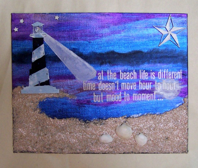 I started my piece byΒ dabbing the blank canvas with jacquard paints in 2 different shades of purple. You can’t see it well because one is iridescent. Next, I painted my 6″ Large Steampunk Clock piece black and adhered it to the canvas slightly off center. I painted the Mushroom Set 1, Mushroom Set 2 and Mushroom Set 3 with white acrylic paint, then added the details using Pitt Markers. I blended white paint, modeling paste and coarse pumice to create the textured spots on the caps. The Wood Veneer Mushrooms were altered just using markers and the textured blend for the spots.