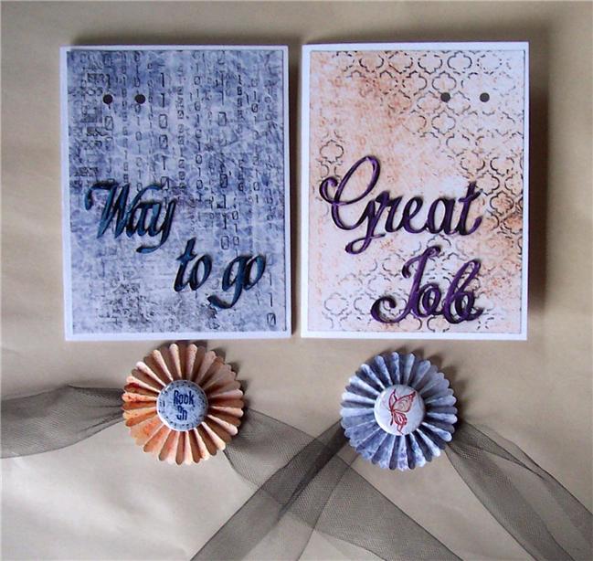 This is with the toppers removed from the cards. As you can see, I just punched two holes to string the ribbon, or in my case tulle, through.