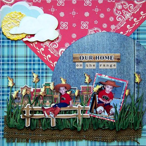 For my take on the sketch, I chose Sasparilla papers and stickers by October Afternoon. They were perfect for my pics of Christian dressed up in Matthew’s Woody (from Toy Story) Halloween costume from last year. He’s wearing the fake boots and the cutie hat and sitting on top of their Lego table. To create a little scene, I fussy cut one of the pics and perched him on the fence chippy layered w/some Dusty Attic laser cut chipboard pieces. This is how it turned out: