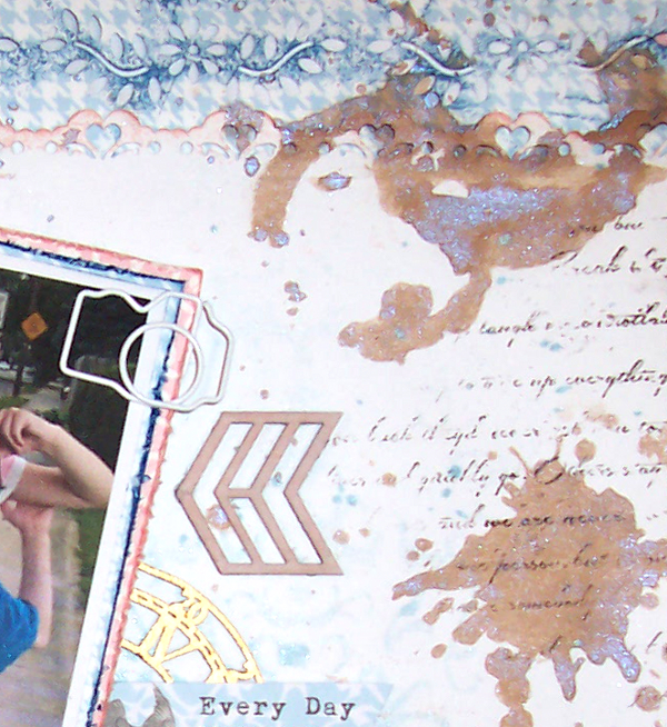 This month, we’re one of the sponsors for the CSI Color Stories Inspiration challenge, so our DT got to play along with some of the challenges as guests. 😀 This page was inspired by case #212 and includes some of my favorite Creative Embellishments pieces. To alter the chippies, and wood veneer chevrons, I lightly coated them all with white gesso so the color could shine through. For the clock piece that I cut in half, I used acrylic paint to give them the gold finish (gold with a touch of bronze). I then altered the title with distress ink, and the flourishes with Lindy’s Stamp Gang color shots. Here’s how my page turned out: