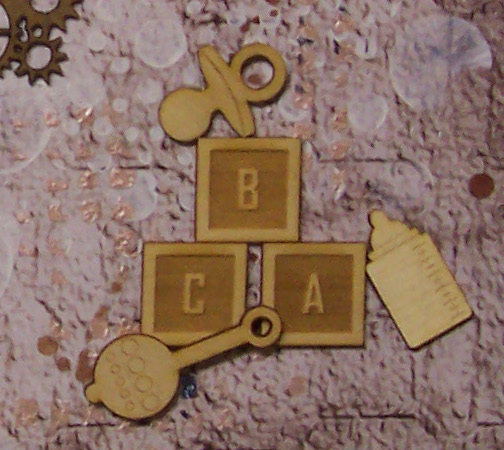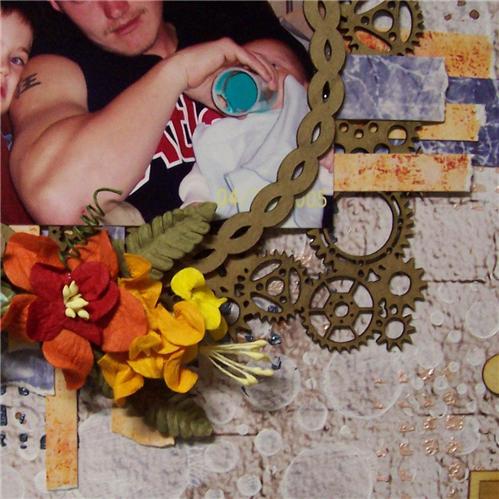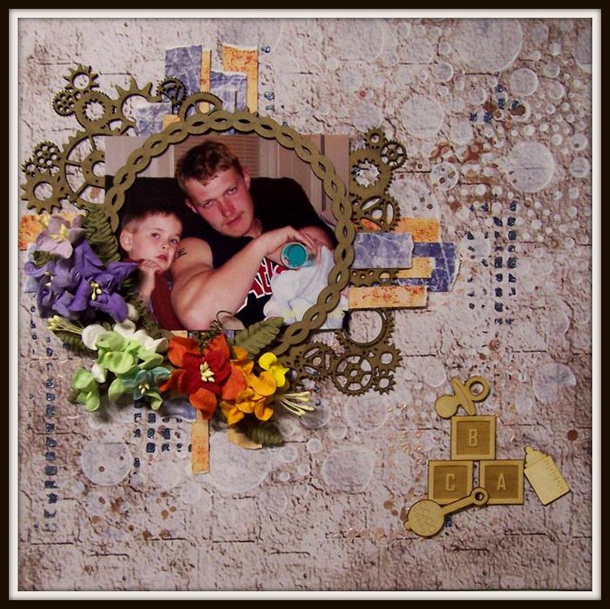 Since my youngest 3 children attend cyber school, we were able to have 3 of the children in a single school photo. 😀 For this piece, I fussy cut to remove the background, then set the pic aside until the end of my project. I started out by adhering my first layer of chippies and coating everything with gesso. As that was drying, I lightly coated the other layered pieces with gesso as well. I then started with the darkest shade of blue mist used and sprayed the border of the canvas board. After adding the Steampunk Corner pieces, I misted again using the same color around the outside edges. I then added the next layer of pieces which included the Mini Hot Air Balloon, Steampunk Light Bulb, Steampunk Pipe Corner, Pocket Watch, and Music Borders and sprayed the whole project with a lighter shade of blue. After that dried, I went over splattered the project with white distress ink and black india ink. Next, I went over some of the edges with black ink to give the layers a little more contrast. I then tucked my photo under the layers and added the eagle piece that I misted with the lightest shade of blue. Last, I added the bare chipboard pieces. Sorry my pics aren’t very clear. Between the glossy photo and the shimmer from the mists, I kept getting a glare, but the pics are blurry without a flash. I’ll try to replace the photos once I can get some daylight. 🙂