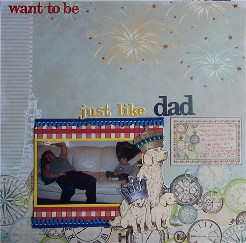 This is the second part of the 2 pager I was talking about the other day. The left page is “You Shine a Light” which I posted a couple of days ago. At the top of the other page, the word “You” is in red block type, so I continued that onto this page adding “want to be” creating a subtitle to link the pages together. I also carried over the puppy w/the oversize crown. The journaling reads, “You have your dad’s magnetic personality and want to be just like him. You wear his shirts & hats & want to do everything he does…even when he’s napping.