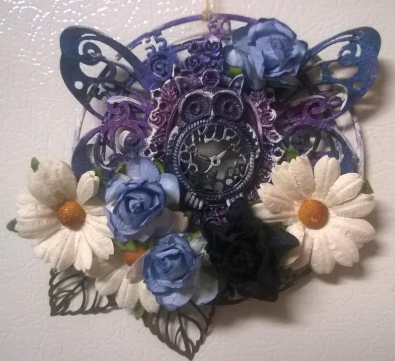 Since I wanted to create a piece to go in my daughter’s bedroom, I decided to go with a fairy theme. She adores everything magical and mystical, especially fairies. 😀 To start out, I peeled of the protective layer that’s over the acrylic to keep it from getting scratched in transit, then used modeling paste and the stencil that comes with the kit and applied a thin layer to the back of the LOVE word piece. Once that dried, I used 2 different colors of Maya Gold metallic paint to coat the back of the Love piece and the base. I used a pink shade for the word and a purple for the base. Once that dried, I applied a Hematite shade to the edges of both pieces. To alter my fairies (sold separately), I used PITT markers and coated the wings with a metallic blue Maya Gold paint. Then finished it off with flowers from my stash and the metal butterfly piece from the kit. Here’s how it turned out: