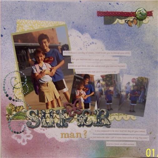 I used sketch#137 from Creative Scrapper and am also submitting it to Scrap Whisper’s challenge to use fabric/material in your layout, and Two Peas in a Bucket for their CHA challenge #10. I went with this color scheme for a challenge on Candy Shoppe Designs (white on white), but I missed the deadline since I’d only found out about it on Saturday and I had the kids all day. oh well! lol