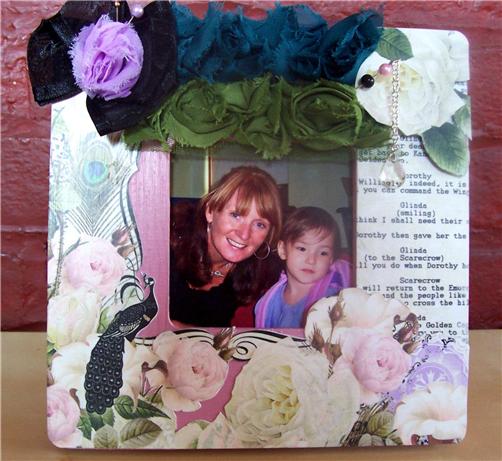 Last weekend, I stopped by JoAnn’s for their 40% off sale on scrapbook supplies. While I was there, I found this cute unfinished wood frame and thought it would be fun to alter for a challenge on Sketches for All. I was originally going to use Graphic45 papers for it, but saw on their blog that one of their DT members made a frame almost exactly like what I had in mind (check it out when you have a chance, great blog for inspiration!). Then I remembered that Webster’s Pages has a challenge on their blog where all you need to do to enter is incorporate some of their bloomers and/or trims in your project. Scrap Whispers is also having a challenge (challenge 88) where you use a forgotten treasure, so I used the paint that Larry had bought last year for Madison’s dollhouse. 😀 Here’s what I came up with: